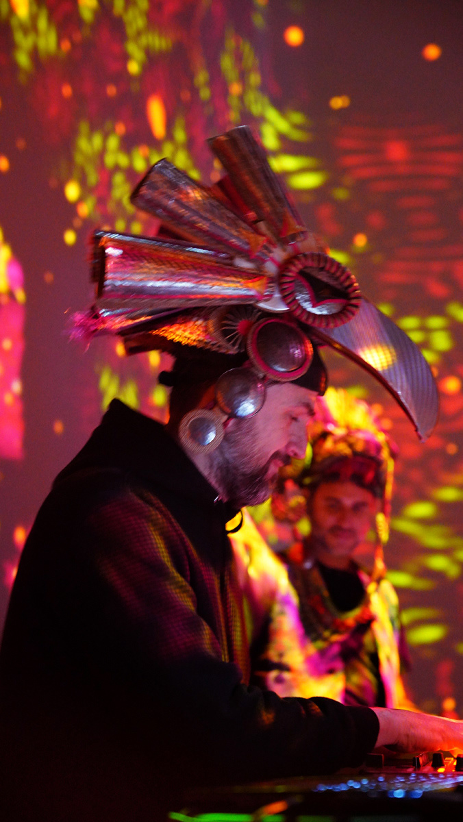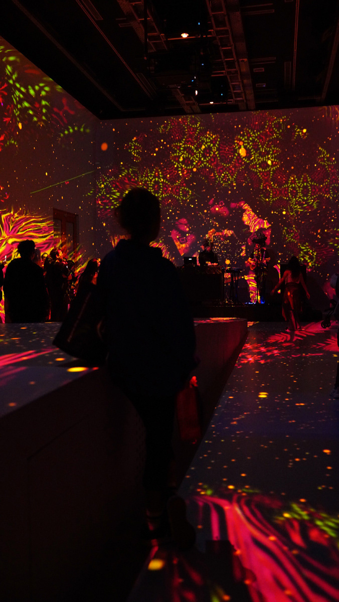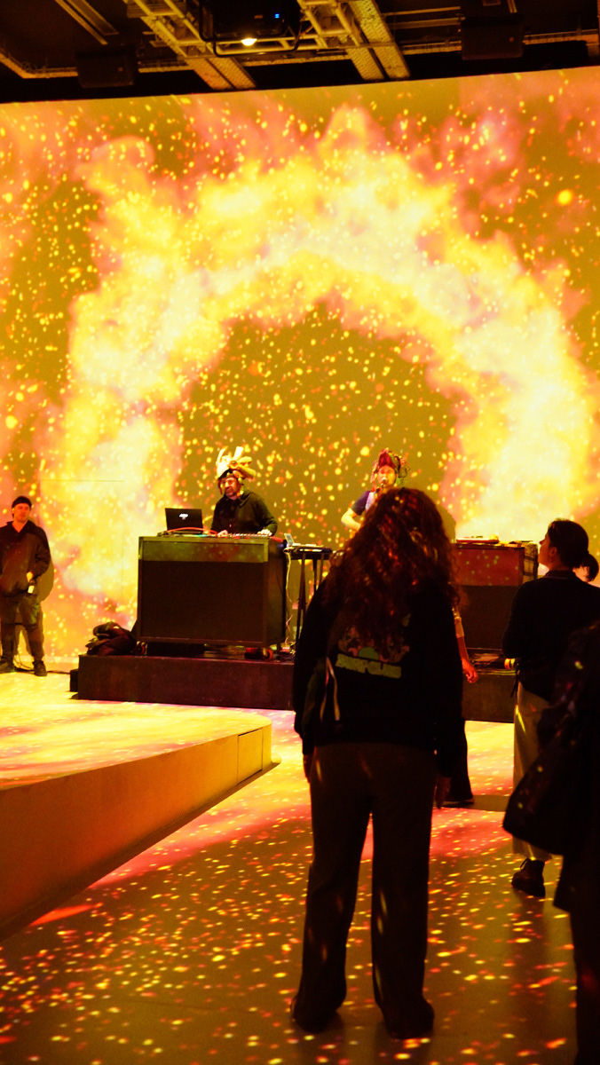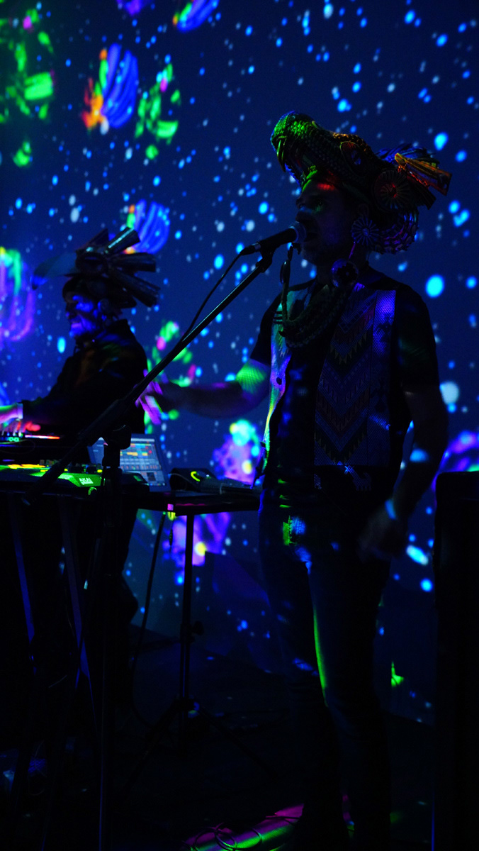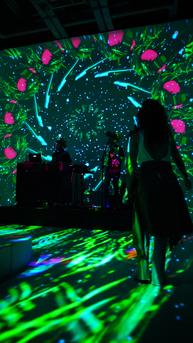 La propuesta fusionó música en vivo y visuales envolventes, transformando el espacio en un paisaje sensorial donde el color y el sonido construyeron una experiencia expandida y emocional.