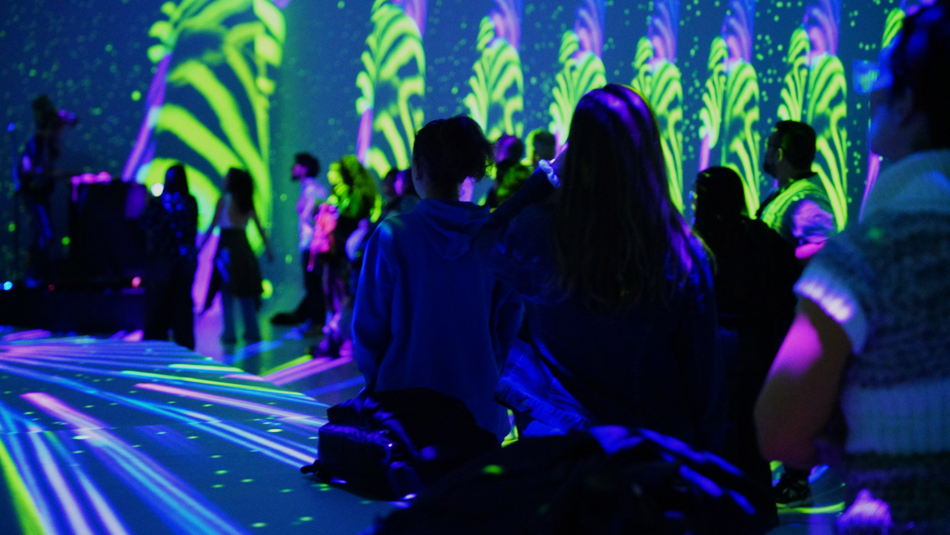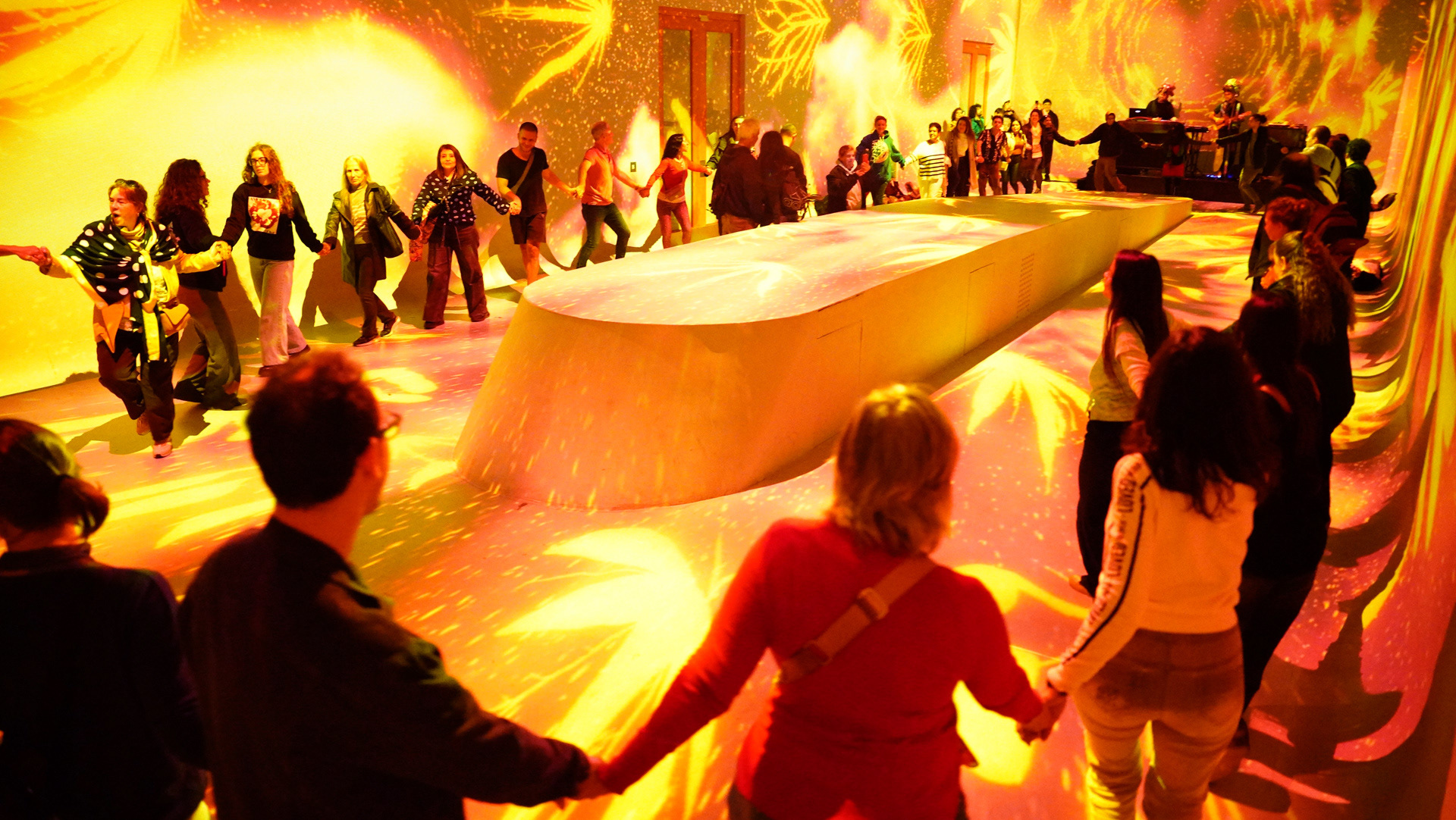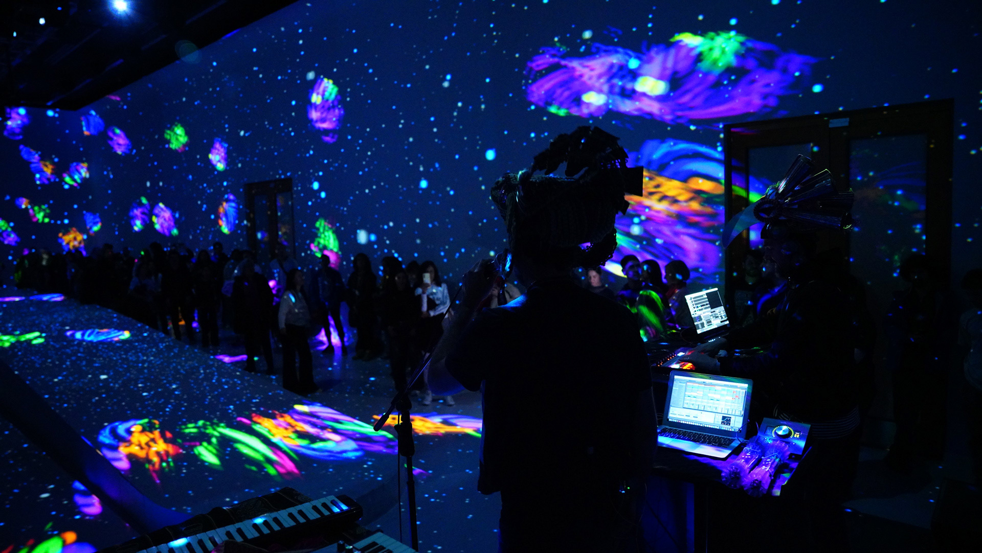 La propuesta fusionó música en vivo y visuales envolventes, transformando el espacio en un paisaje sensorial donde el color y el sonido construyeron una experiencia expandida y em